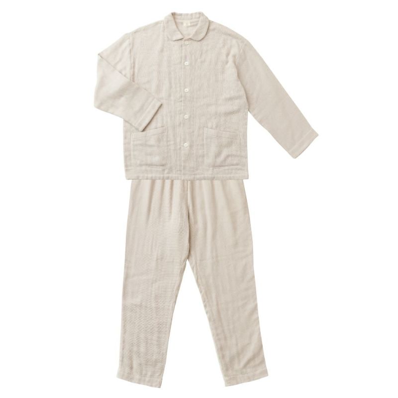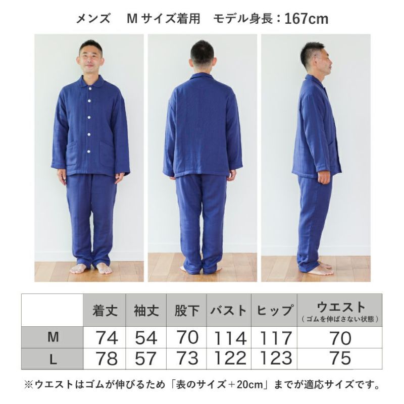 「ふわふわして暖かい素材は、どれも化学繊維ばかり…」 「ガーゼは柔らかくて気持ちが良い。冬にも使えたらなあ…」 そんなお声から生まれた、ボリュームがあって冬でも暖かい「天然素材」のパジャマです。 【商品詳細】 素材:綿100% 日本製 洗濯可(洗濯ネット仕様) ※乾燥機のご使用はお避けください。 ※天然素材の性質上、洗濯後に多少の縮みがあります。 サイズ: 【Mサイズ(cm)】着丈74/袖丈54/チェスト114/ウエスト70(ゴムを伸ばさない状態)/股下70/ヒップ117 【Lサイズ(cm)】 着丈78/袖丈57/チェスト122/ウエスト75(ゴムを伸ばさない状態)/股下73/ヒップ123 ※ウエストはゴムが伸びますので、+20cmまでが適応ウエストサイズとお考えください。
