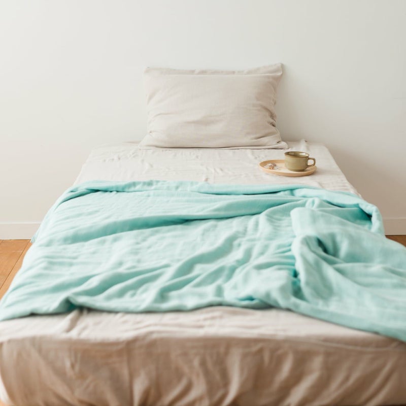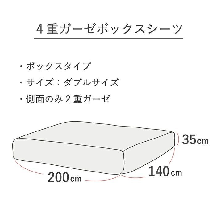 柔らかくて肌に優しい、4重ガーゼのボックスシーツがついに登場。 ケットや枕カバーと一緒に使えば、ガーゼに包まれる心地よさを全身で感じることができます。 マットレスだけでなく、敷布団にもお使いいただけます。 【商品詳細】 素材:綿100% サイズ:200cm × 140cm × 35cm(ダブルサイズ) 日本製 洗濯可(洗濯ネット仕様) ※乾燥機のご使用はお避けください。 ※天然素材の性質上、洗濯後に多少の縮みがあります。