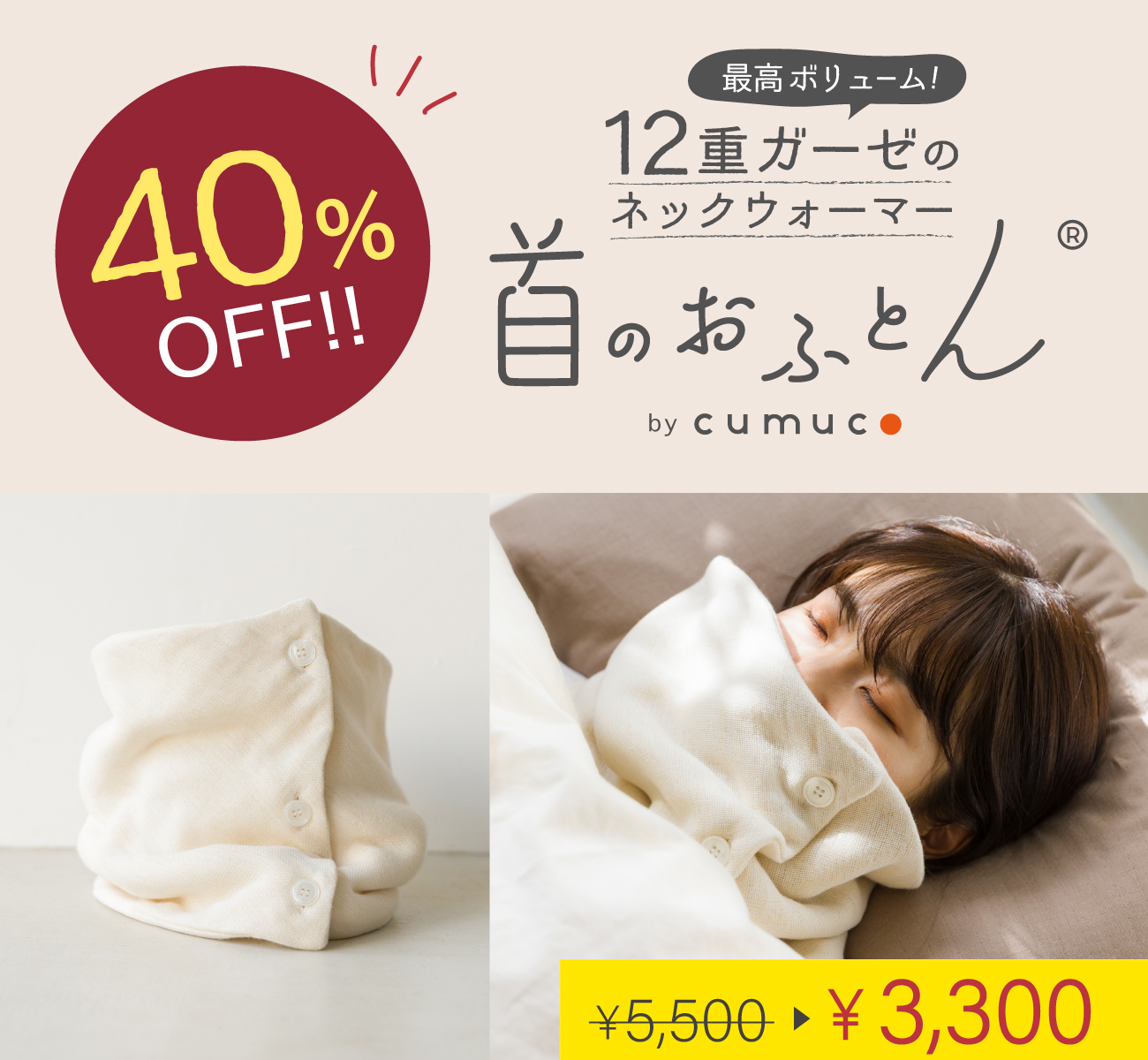 他の画像を見る 染めてない生成り色。生地の柔らかさが活きています。 【40%OFF】クムコ 首のおふとん 湯洗い12重ガーゼ ネックウォーマー 定価 ¥ 5,500 のところ 販売価格 ¥ 3,300 税込 販売期間 2026/03/06 12:00 〜 2026/03/11 23:59 カートに入れる お気に入りに登録する