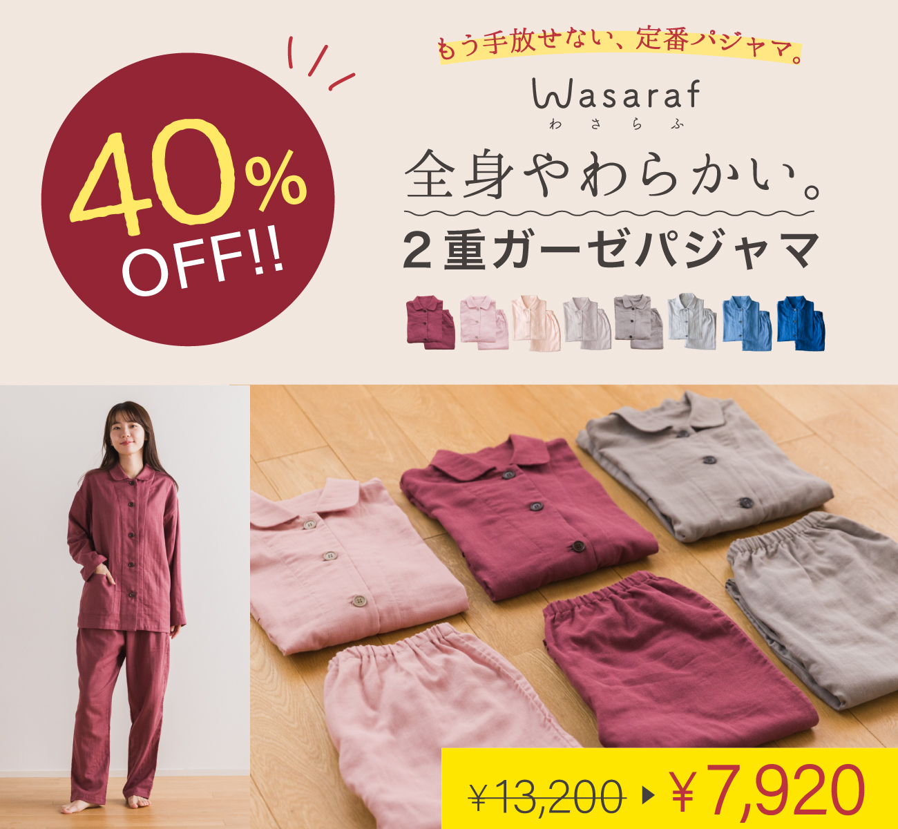 他の画像を見る 『ストレスフリーガーゼ』で全身やわらかい。2重ガーゼパジャマ。 【40%OFF】Wasaraf 和さらし2重ガーゼ長袖パジャマ 定価 ¥ 13,200 のところ 販売価格 ¥ 7,920 税込 販売期間 2026/03/06 12:00 〜 2026/03/11 23:59 詳細を見る お気に入りに登録する