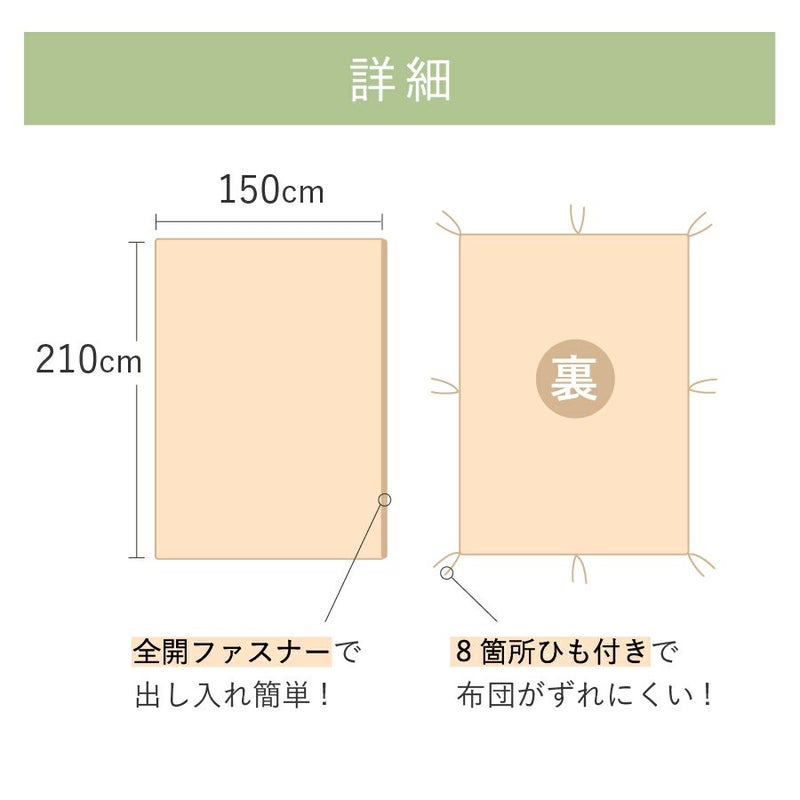 ・選べるカラフルな10色。 ・素材はお肌に優しい綿100%。 商品詳細 ●サイズ:150cm×210cm ●素材:綿100% ●仕様:YKKファスナ ー製全開ファスナー ●生産国:日本 ●色:全10色 ※画像の色合いについてはモニターの種類や設定により、多少異りますのでご了承下さい。