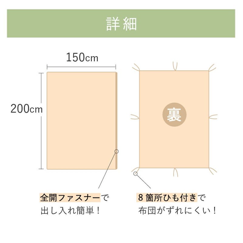 【商品詳細】 商品名:セレクトカラー 掛け布団カバー サイズ:150×200cm(シングル) カラー:ホワイト・クリーム・グリーン・ブルー・ピンク 素材:綿100% 仕様:YKK製全開ファスナー、8か所ヒモ付き 生産国:日本製 その他: ・濃色は多少色落ちすることがありますので、他の物とのお洗濯はお避け下さい。 ・長時間の水への浸漬はお避け下さい。 ・乾燥機によるタンブル乾燥はお避け下さい。 ・ご注文者様とお届け先が異なる場合、納品書の送付はいたしておりません。