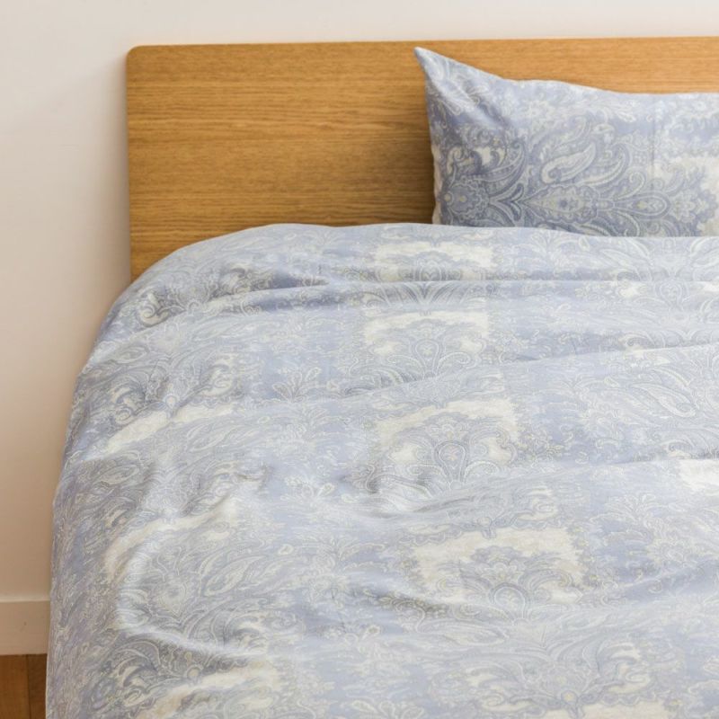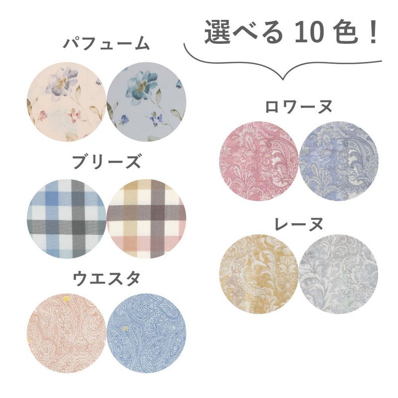 【商品詳細】 商品名:布団カバー3点セット サイズ 掛カバー:150×210cm(シングルロング) 敷カバー:105×215cm(シングルロング) ピロケース:43×63cm プリント(カラー): ・パフューム(ピンク・ブルー) ・ブリーズ(ピンク・ブルー) ・ウエスタ(ベージュ・ブルー) ・ロワール(ピンク・ブルー) ・レーヌ(ベージュ・ブルー) 素材:綿100% 生産国:日本製 仕様 ・YKK製全開ファスナー ・掛カバーリング:8か所ヒモ付き ・ピロケース: パフューム、ウエスタ、ロワール、レーヌ(ファスナータイプ) ブリーズ(ファスナーレスタイプ) その他 ・濃色は多少色落ちすることがありますので、他の物とのお洗濯はお避け下さい。 ・長時間の水への浸漬はお避け下さい。 ・乾燥機によるタンブル乾燥はお避け下さい。 ・ご注文者様とお届け先が異なる場合、納品書の送付はいたしておりません。