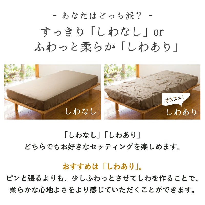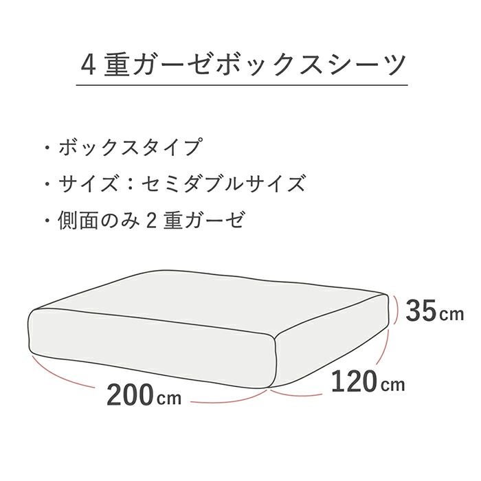 柔らかくて肌に優しい、4重ガーゼのボックスシーツがついに登場。 ケットや枕カバーと一緒に使えば、ガーゼに包まれる心地よさを全身で感じることができます。 マットレスだけでなく、敷布団にもお使いいただけます。 【商品詳細】 素材:綿100% サイズ:200cm × 120cm × 35cm(セミダブルサイズ) 日本製 洗濯可(洗濯ネット仕様) ※乾燥機のご使用はお避けください。 ※天然素材の性質上、洗濯後に多少の縮みがあります。