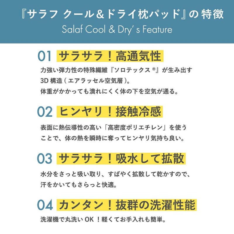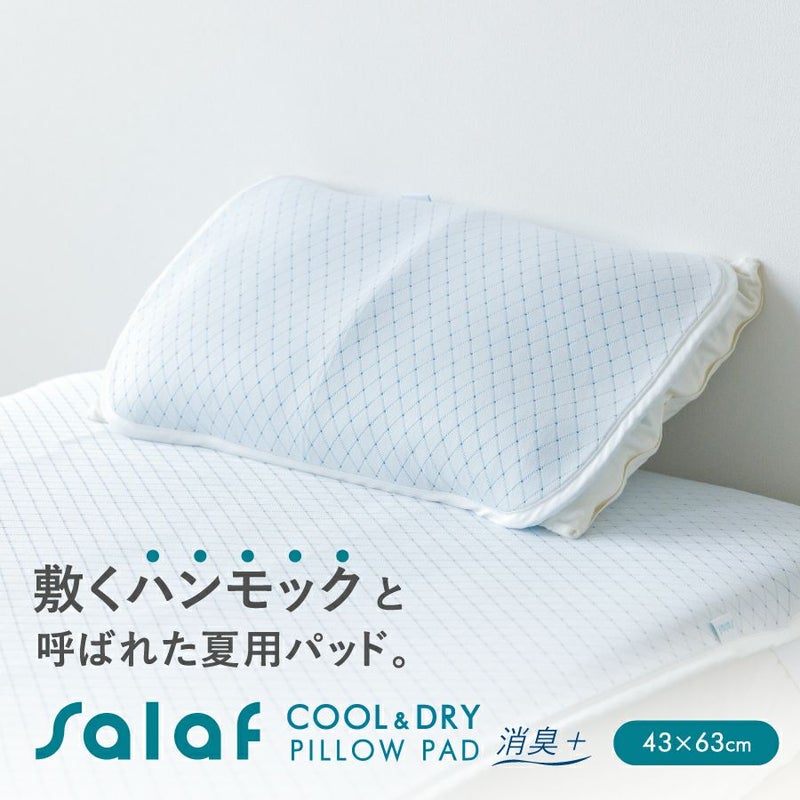 熱帯夜対策に!リバーシブルで使える&消臭効果付き! お手持ちの枕に取り付け簡単♪3D構造の夏用枕パッドです。 【商品詳細】 商品名:サラフ クール&ドライ枕パッド 消臭+ サイズ : 45×65×厚さ8mm 素材:ポリエステル70%、ポリエチレン30% 仕様:ゴムバンド2本付き、リバーシブルタイプ 原産国:日本製 その他: ・洗濯ネットをご使用ください。 ・タンブル(乾燥機)乾燥はお避けください。 ・洗濯後は放置せず、すぐに形を整えて干してください。 ・皮膚に炎症がある時や肌に異常を感じた時はご使用をお控えください。