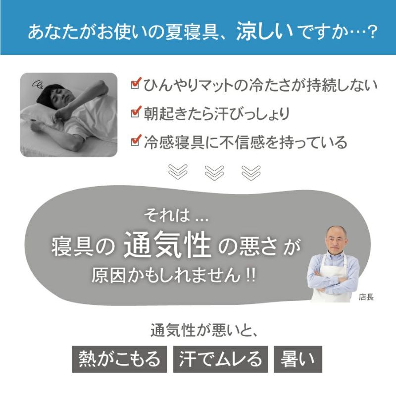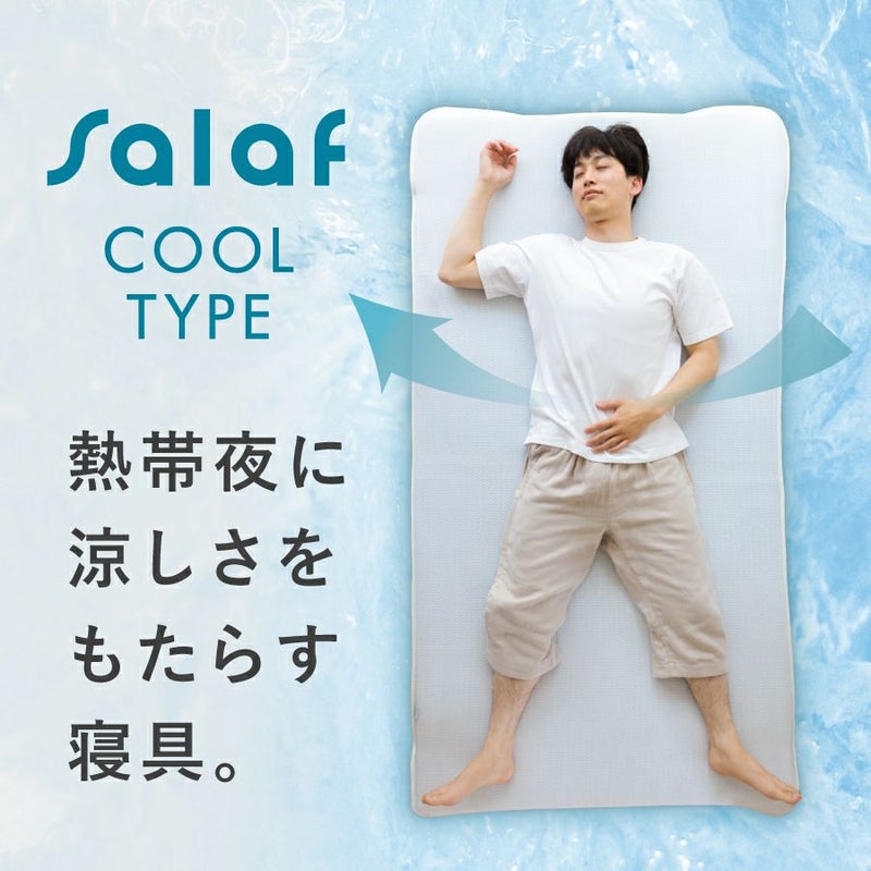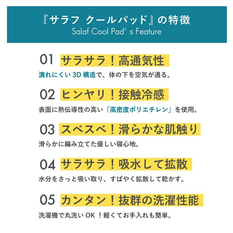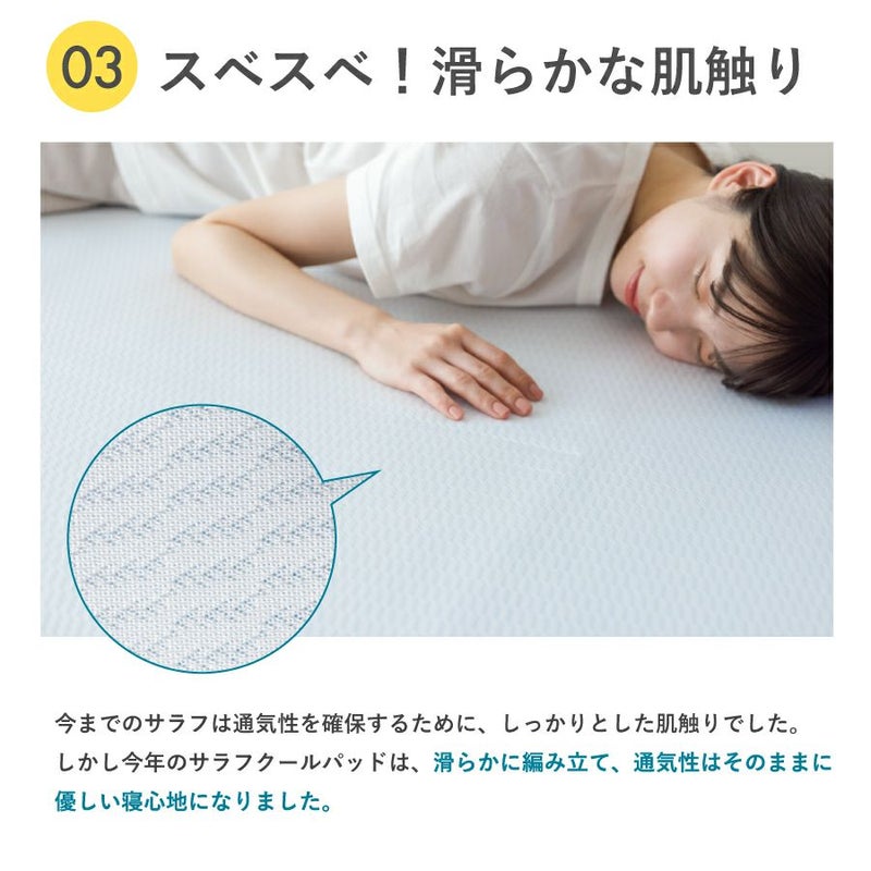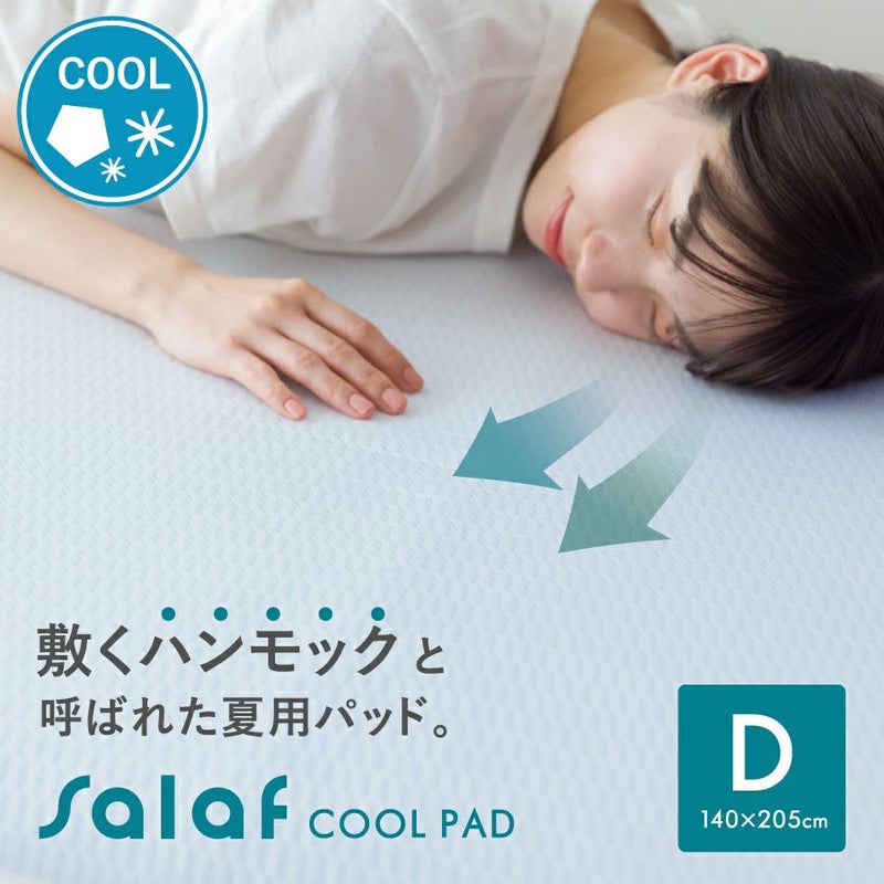 ヒンヤリ接触冷感!通気性抜群! お手持ちのお布団やマットレスに取り付けられる、3D構造の夏用敷パッドです。 【商品詳細】 商品名:サラフ クール敷きパッド ダブルサイズ サイズ : ダブルサイズ(140×205cm) 素材:ポリエステル70%、ポリエチレン30% 仕様:四隅ゴムバンド付き 原産国:日本製(この商品は全て日本国内で企画製造されたものです。) その他: ・洗濯ネットをご使用ください。 ・タンブル(乾燥機)乾燥はお避けください。 ・洗濯後は放置せず、すぐに形を整えて干してください。 ・皮膚に炎症がある時や肌に異常を感じた時はご使用をお控えください。