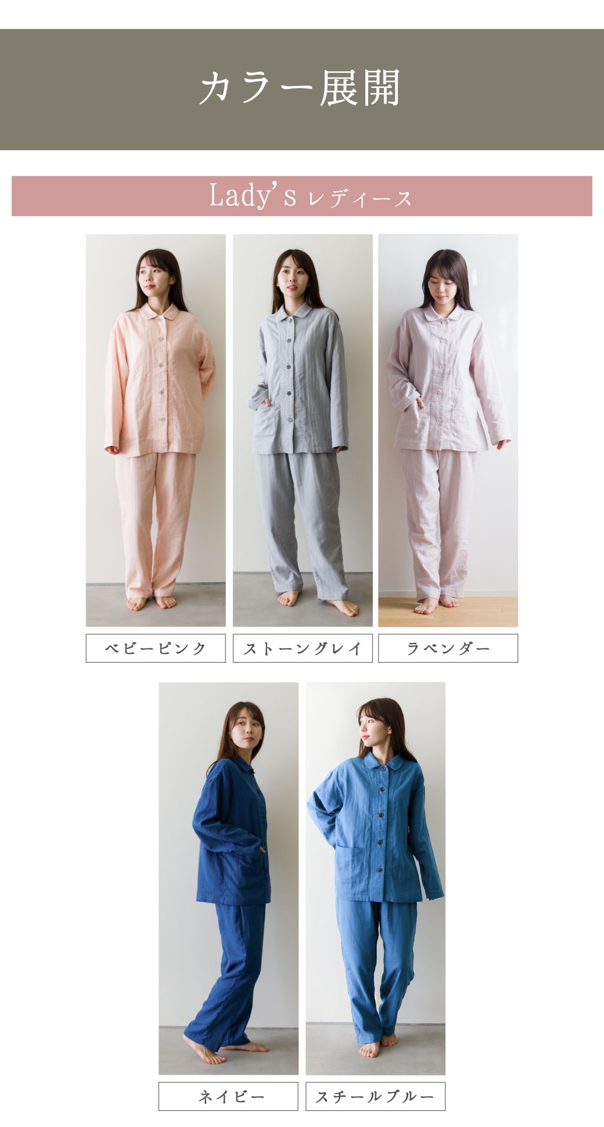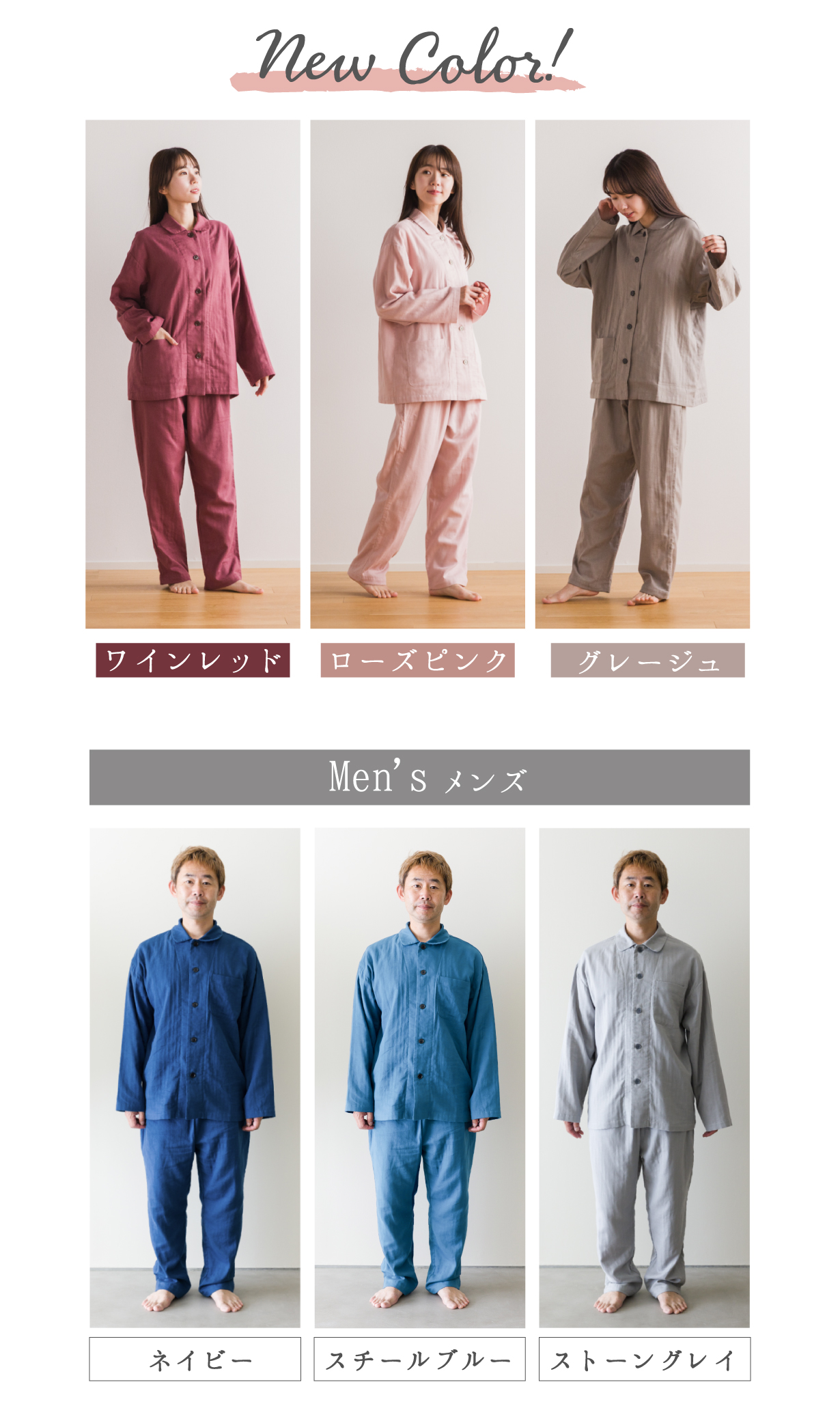 モデル身長:162cm、Mサイズ着用 寝具の専門家が作ったガーゼパジャマ。ハリのない柔らかな肌触りで心地のいい睡眠を… 【商品詳細】 サイズ:レディスM/L、メンズM/L カラー: 【レディース】ベビーピンク・ネイビー・ストーングレイ・ローズピンク・グレージュ・ワインレッド 【メンズ】ネイビー・グレーストーングレイ・グレージュ 素材:綿100% 日本製(企画から製造工程全て日本で行っています。) 洗濯可(洗濯ネット使用) ※乾燥機のご使用はお避けください。
