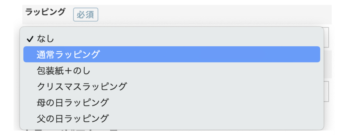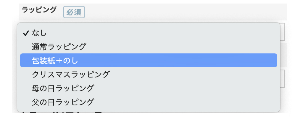 1.注文したい商品ページの、【ラッピング】の項目から【包装紙+のし】を選択し、カートに入れてください。