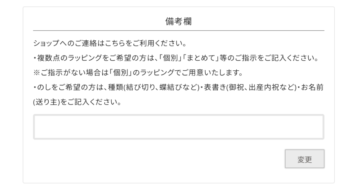 2.ご注文手続き画面にて【備考欄】の変更ボタンをクリックし、 【のしの種類】【表書き】【送り主のお名前】をご記入ください。