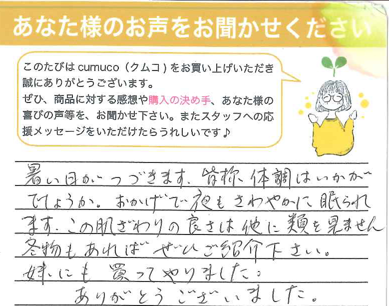 おかげで夜もさわやかに眠られます