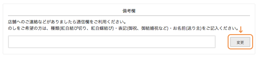 2.ご注文手続き画面にて【備考欄】の変更ボタンをクリックし、 【のしの種類】【表記】【送り主のお名前】をご記入ください。